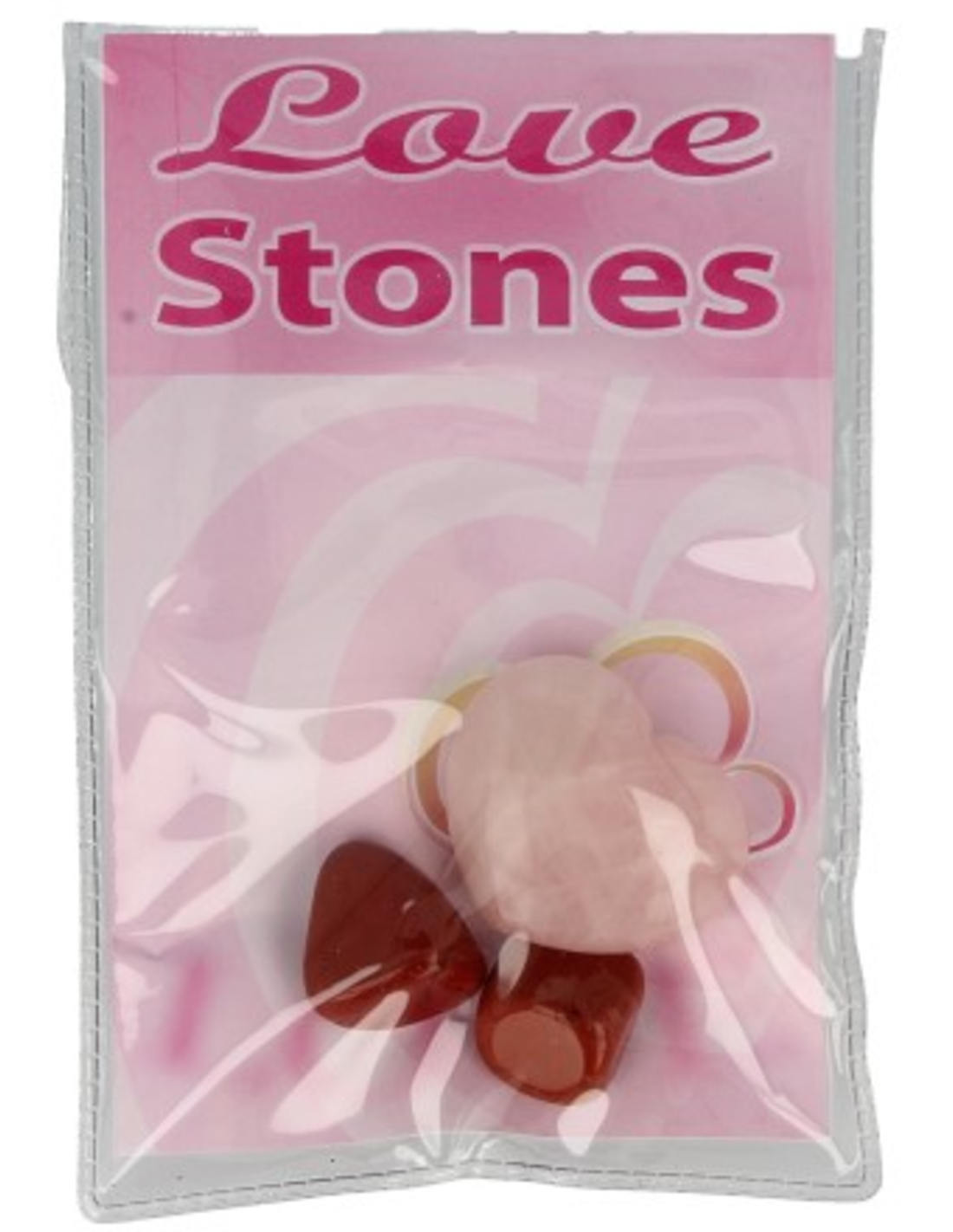 Extra Omschrijving 1 | Setje van een Roze kwarts edelsteen hart met rode Jaspis trommelsteentjes, inclusief een buideltje. |